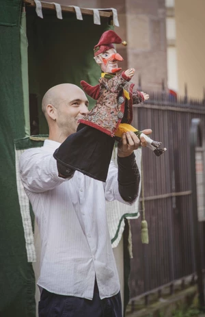 Un spectacle de marionnettes à gaines en castelet, d’après la cruelle tradition anglaise apparue dans le courant du 17e siècle et qui serait issue de la Commedia dell’arte.